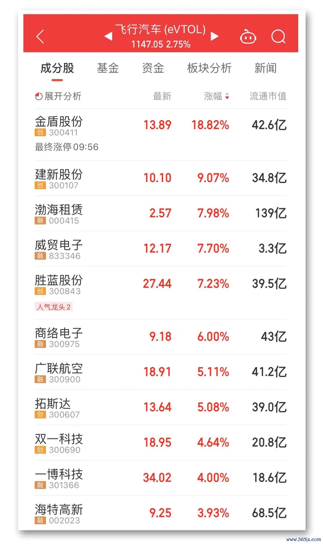 今天上午,飞行汽车板块迎来反弹,金盾股份、建新股份等个股大涨。