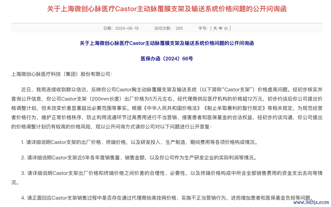 8月19日,国家医保局官网发布《关于上海微创心脉医疗Castor主动脉覆膜支架及输送系统价格问题的公开问询函》。