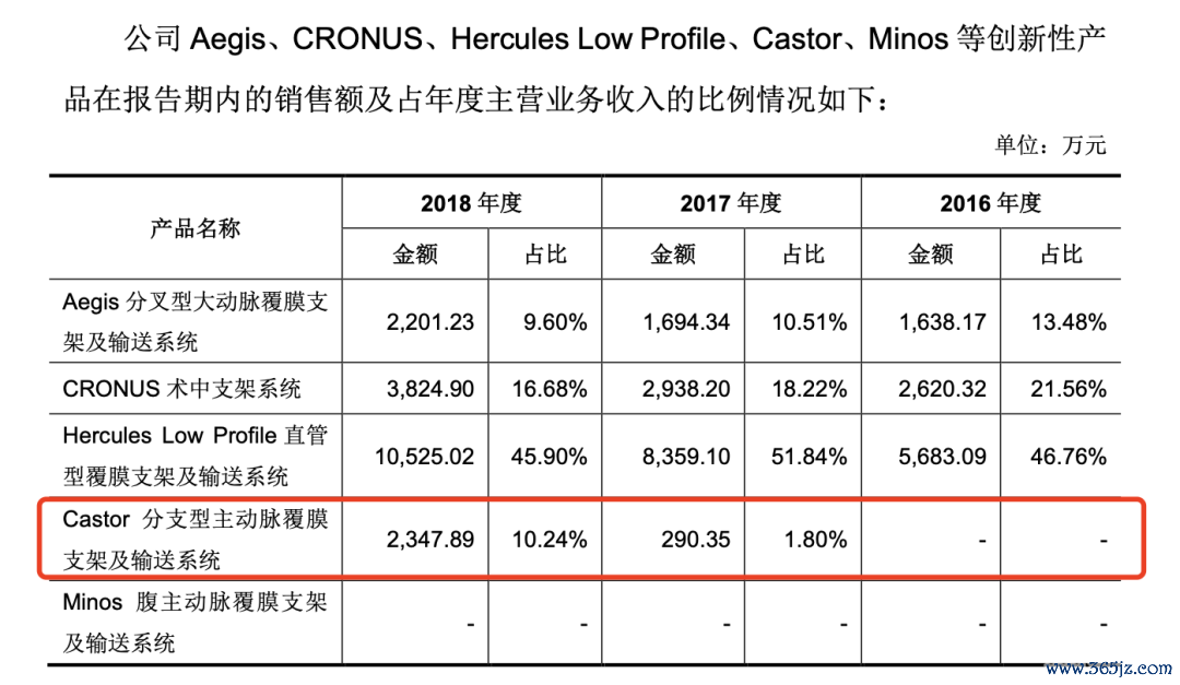上市后,Castor支架在心脉医疗收入中的占比快速提升,2017年为1.8%,2018年攀升至10.24%。