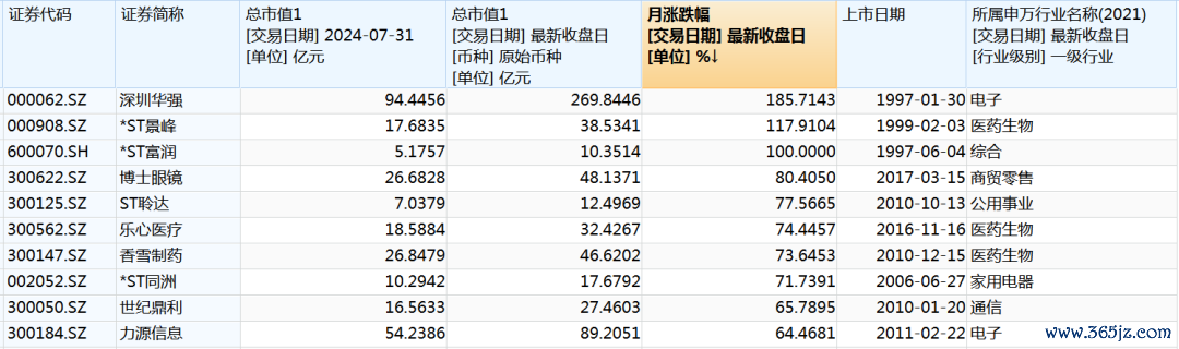 8月,数据显示,A股共有1278只股票涨幅为正,36只股票涨幅超过30%,14只股票涨幅超过50%。8月涨幅居前的十只股票分别为:深圳华强、*ST景峰、*ST富润、博士眼镜、ST聆达、乐心医疗、香雪制药、*ST同洲、世纪鼎利、力源信息,其中8只股票涨幅超过70%。