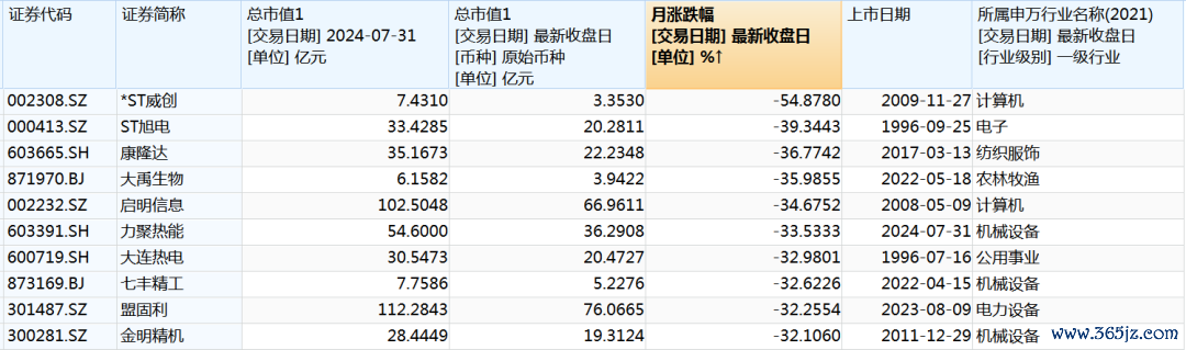 整个8月,Wind数据显示,剔除8月上市的新股,8月跌幅前十的个股分别为:*ST威创、ST旭电、康隆达、大禹生物、启明信息、力聚热能、大连热电、七丰精工、盟固利、金明精机。其中,跌幅最大的*ST威创大跌54.88%。*ST威创8月23日收到深交所下发的《事先告知书》,由于公司股票在2024年7月26日至8月22日期间,连续二十个交易日的每日收盘价均低于1元,深交所决定终止公司股票上市交易。