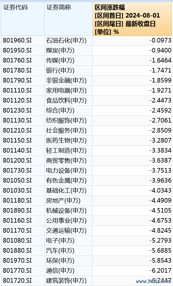 Wind数据显示,8月,申万一级31个行业全线下跌,跌幅最小的石油石化行业下跌0.10%,国防军工、农林牧渔、美容护理行业跌幅居前,分别下跌8.91%、8.36%、8.13%。